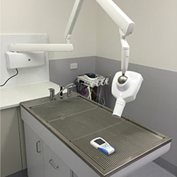The full-swivel ball-joint is revolutionary in every sense. The tube head revolves freely around the sphere, so that practically any position can be achieved, including vertical. An automatic touch-sensitive lock-on/lock-off device enables effortless repositioning of the tube head between exposures. The wireless handheld remote allows you to program / operate the unit from wherever you are in the surgery. There are no other wall-mounted or wired control panels to worry about. Easy-to-use and easy-to-handle, the remote offers a full range of intuitive exposure scenarios designed to make correct X-ray acquisition a straightforward process. No more complex programming or button-crowded panels. The Revolution 4DC automatically defines the correct exposure and adjusts the kV and mA by selecting the tooth on the vet specific display.